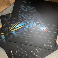 As the colors peeking through the lettering on the album’s cover give a hint of Alison’s glass world waiting behind, we thought it would only be fitting for the vinyl itself to recall the look of Alison’s glass work. So we conceived of a clear, transparent vinyl, splattered with the same colors that appear in the window of Alison’s that Yann Lagoutte had photographed. It took quite a bit of research to find a vinyl plant that was able to help us realize this vision. Luckily we discovered B-Side Factory, a vinyl production company outside Nantes that focuses specifically on small-batch projects by independent artists. They were able to help us achieve this effect, resembling an explosion of glass and color, in both visual and conceptual harmony with Alison’s work.