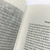For the cover, we mirrored the title and author as well as the flames. On the inside, an image of the ashen remains of the fire repeats as a ghostly backdrop on the left-hand pages, in which we can make out the mirror images of the poems, printed in white letters in reverse, while on the right-hand pages we find the text in black over an off-white page, where we can just make out the edges of the ash-scape peeking through from the page that follows. The facing images are haunting reversals of each other, reminding us that every observation is stalked by through our minds by its opposite.